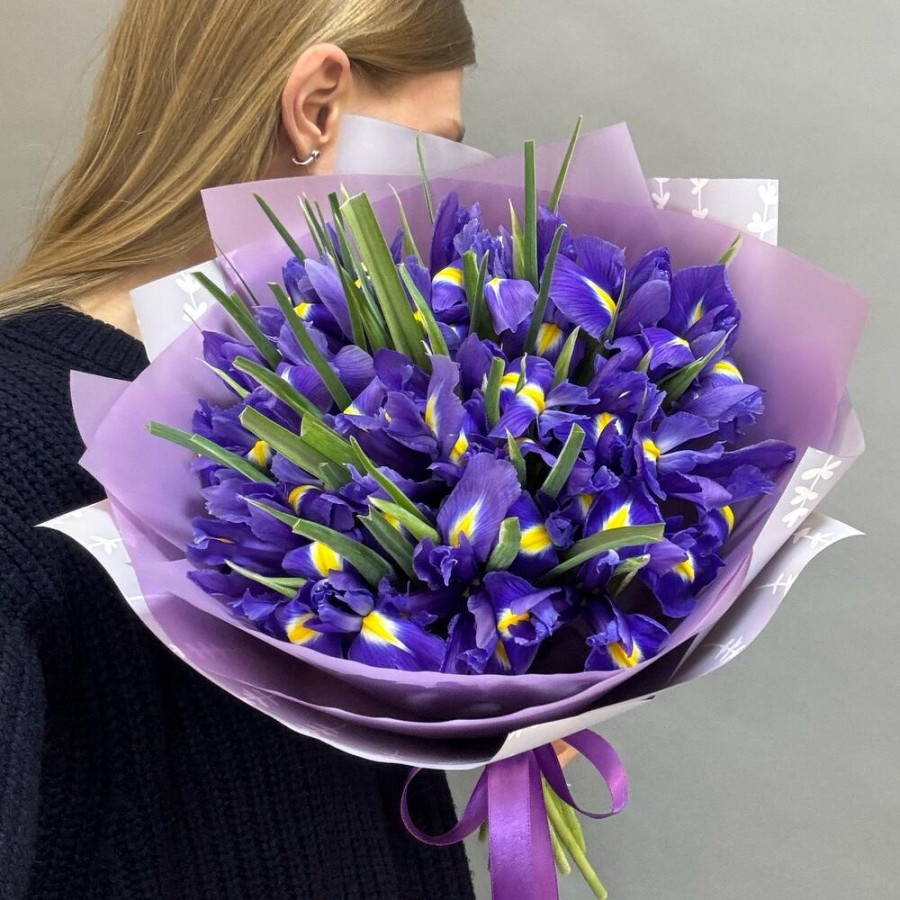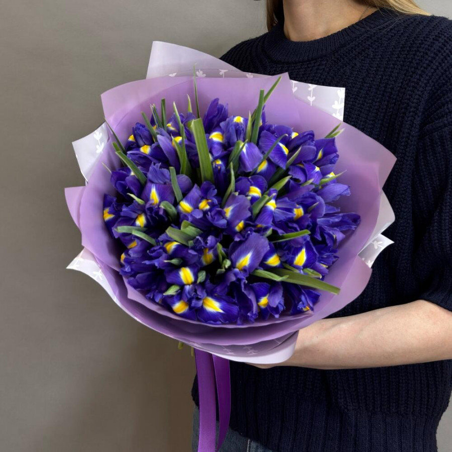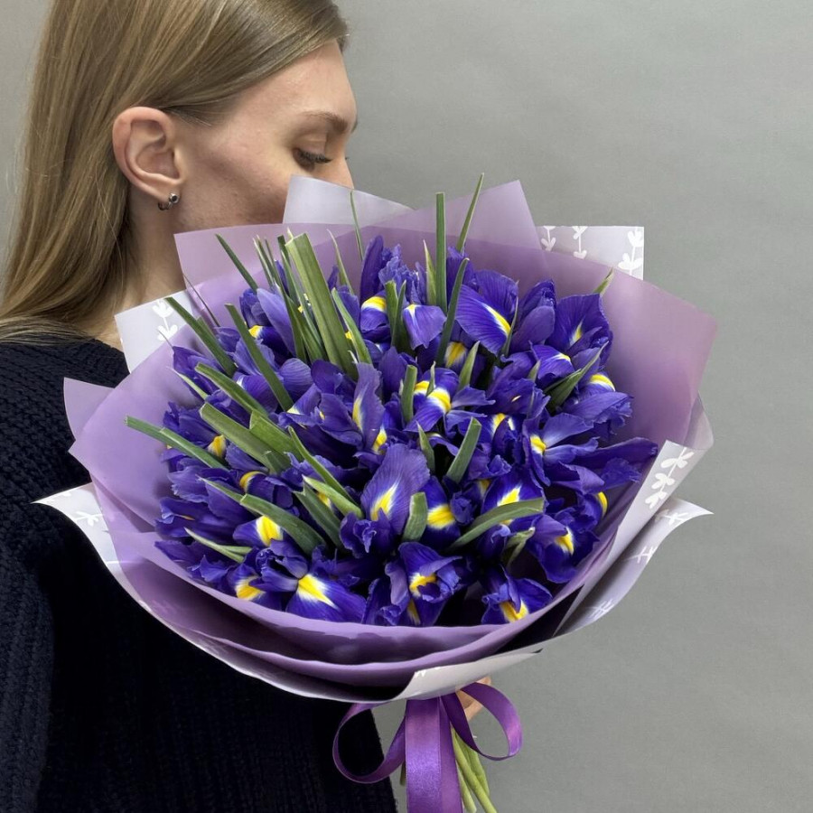 На фото букет из 19 синих ирисов. В составе: ирис 19 шт, дизайнерская упаковка 2 шт, атласная лента 1 шт, . Все цветы свежие и ароматные, букет красиво оформлен и отлично подходит для подарка. Доступна доставка цветов или самовывоз.