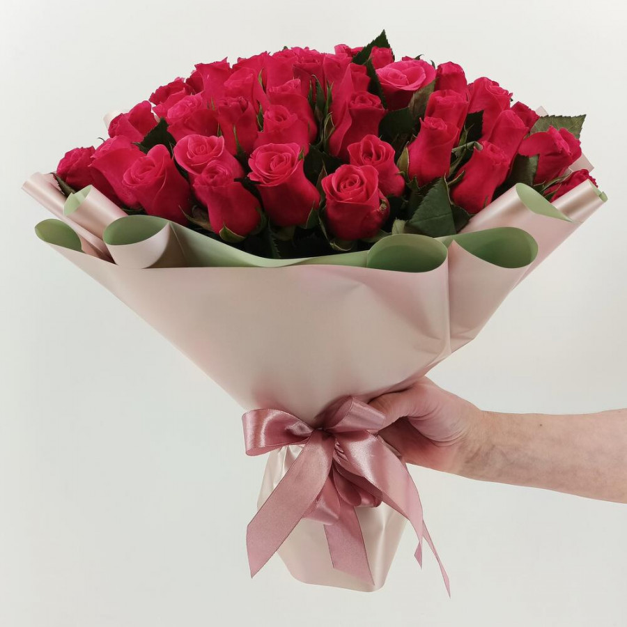 На фото букет из 51 малиновой розы. В составе: роза 51 шт, дизайнерская упаковка 1 шт, атласная лента 1 шт, . Все цветы свежие и ароматные, букет красиво оформлен и отлично подходит для подарка. Доступна доставка цветов или самовывоз.