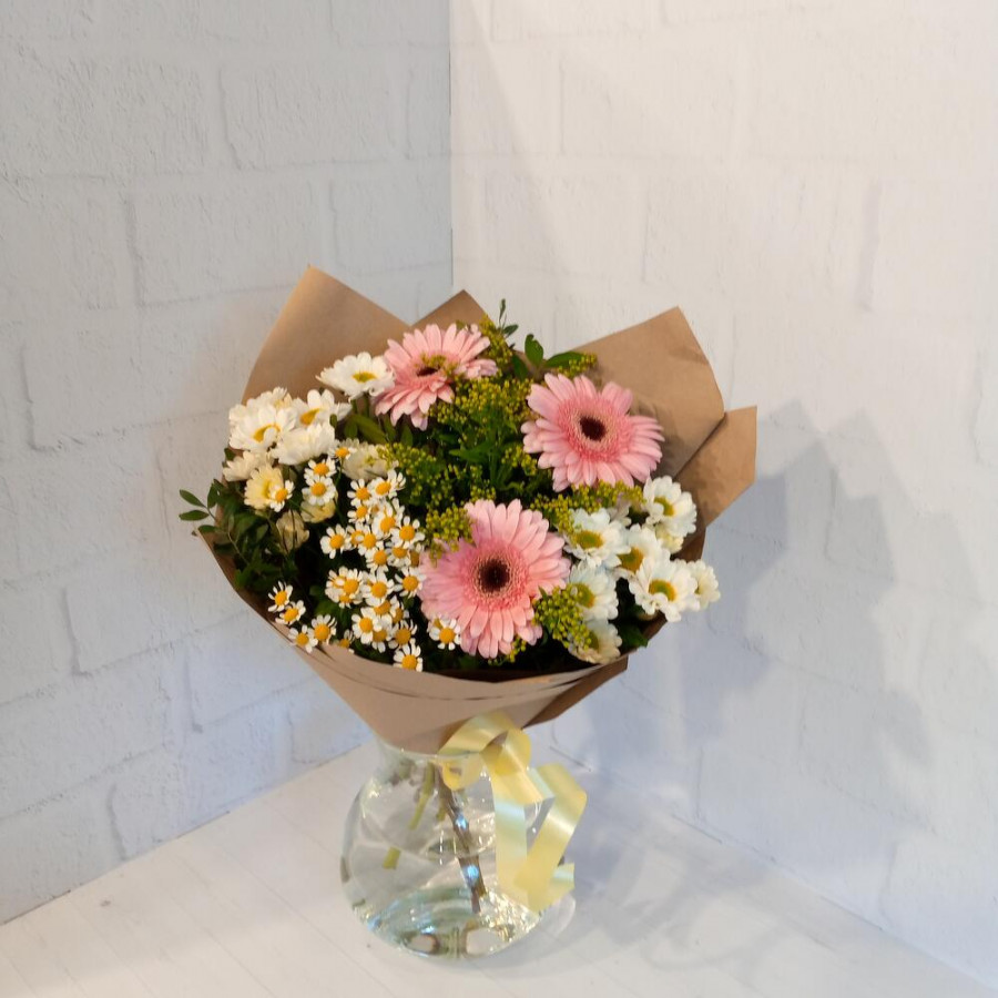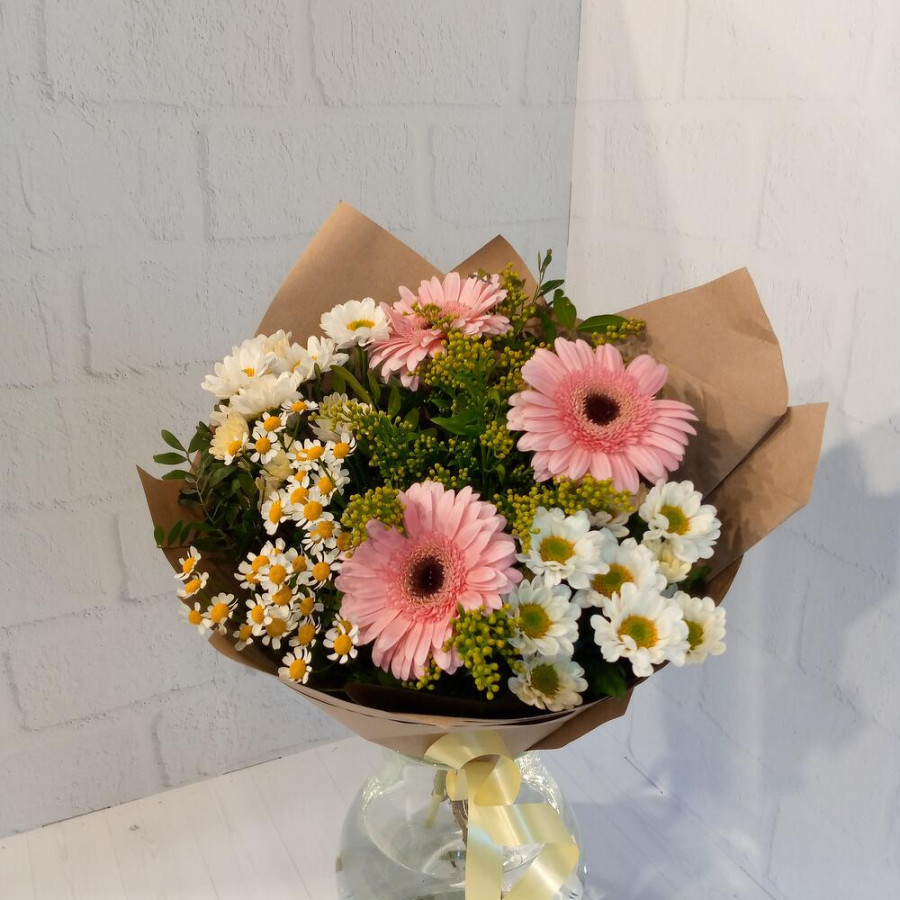 На фото букет «дачное настроение». В составе: гербера 3 шт, хризантема кустовая 2 шт, танацетум 1 шт, солидаго 2 шт, дизайнерская упаковка 1 шт, атласная лента 1 шт, . Все цветы свежие и ароматные, букет красиво оформлен и отлично подходит для подарка. Доступна доставка цветов или самовывоз.
