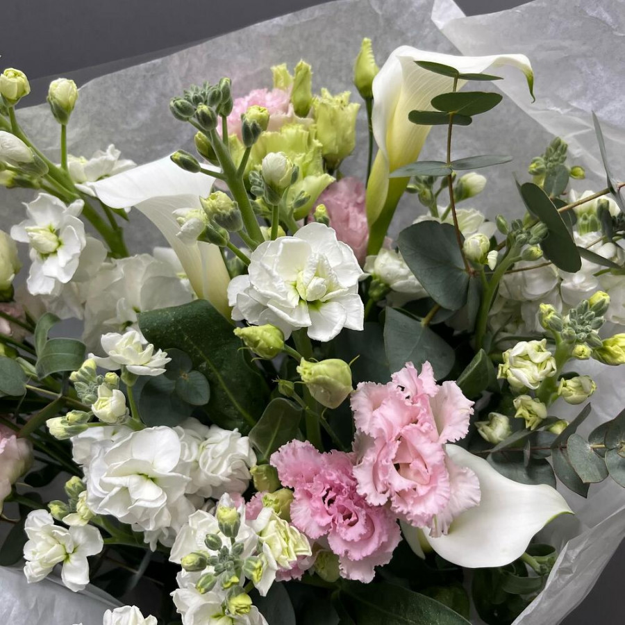 На фото букет «королевский акцент». В составе: калла 3 шт, эустома (лизиантус) 3 шт, маттиола 5 шт, эвкалипт 1 шт, дизайнерская упаковка 2 шт, атласная лента 1 шт, . Все цветы свежие и ароматные, букет красиво оформлен и отлично подходит для подарка. Доступна доставка цветов или самовывоз.