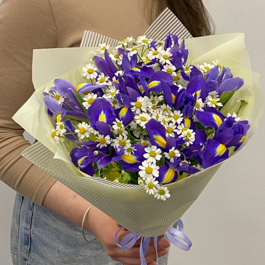 На фото букет «луговая сказка». В составе: ирис 5 шт, танацетум 4 шт, дизайнерская упаковка 1 шт, атласная лента 1 шт, . Все цветы свежие и ароматные, букет красиво оформлен и отлично подходит для подарка. Доступна доставка цветов или самовывоз.