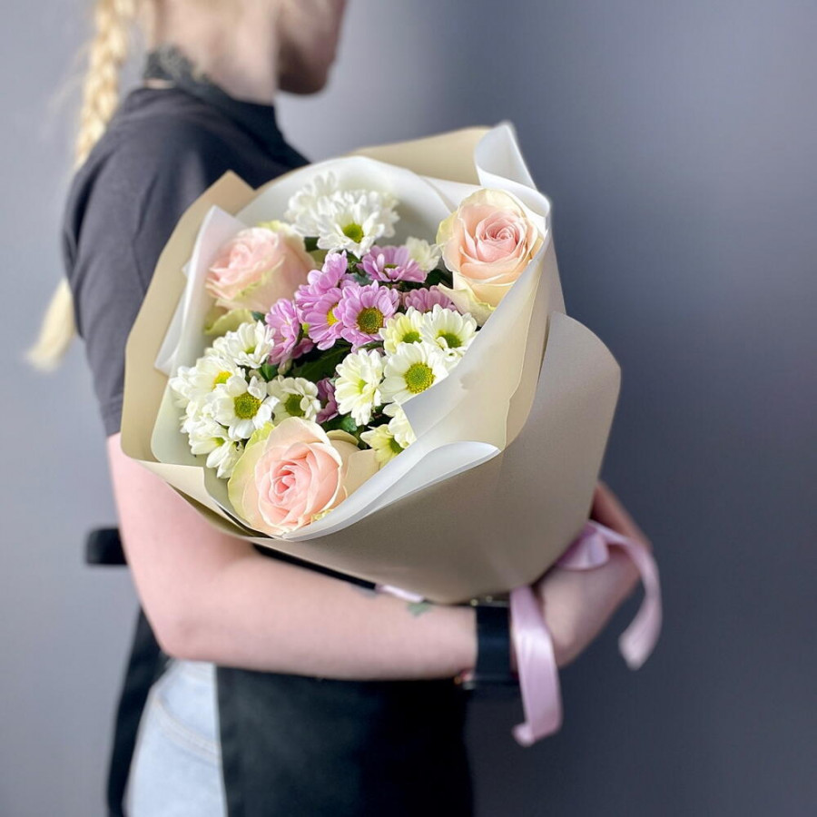На фото букет «нежный свет». В составе: роза 3 шт, хризантема кустовая 4 шт, дизайнерская упаковка 1 шт, атласная лента 1 шт, . Все цветы свежие и ароматные, букет красиво оформлен и отлично подходит для подарка. Доступна доставка цветов или самовывоз.