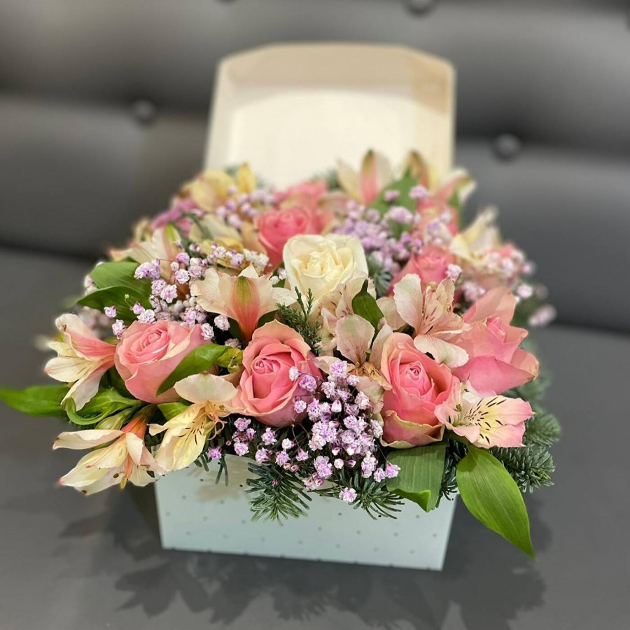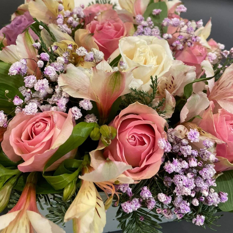 На фото композиция из альстромерии и роз. В составе: роза 5 шт, альстромерия 3 шт, статица 3 шт, аспидистра 2 шт, коробка (s) 1 шт, . Все цветы свежие и ароматные, букет красиво оформлен и отлично подходит для подарка. Доступна доставка цветов или самовывоз.